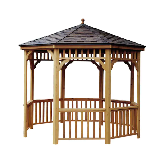 If you’re looking for a traditional wooden outdoor gazebo, this durable, pre-cut (i.e. easy to assemble), and decay-resistant 10 ft. round tight-knot cedar gazebo is the one for you. Perfect as a decoration (vines and other plants look great on this one) vessel, it also glows with a stunning tone that ensures smooth and effective blending-in in no matter what your backyard landscape situation is.